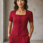 Women Maroon Square Neck Half Sleeves Button Top