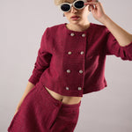 Women Maroon Tweed Full Sleeves Crop Blazer With Mini Skirt