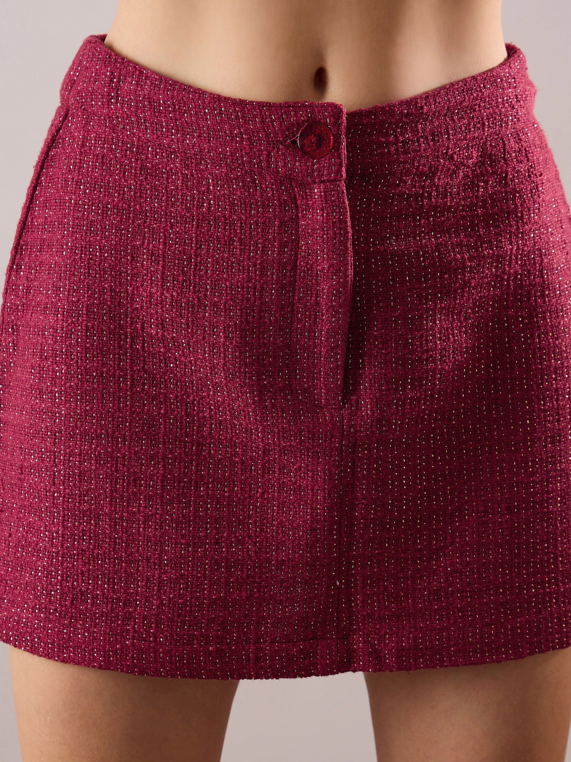 Maroon Tweed Full Sleeves Crop Blazer With Mini Skirt, in Tweed fabric, Unlined, Crop Length, Regular Fit, Button Closure, Straight Hemline and features Metal Button Detail At Front / Elastic At Back