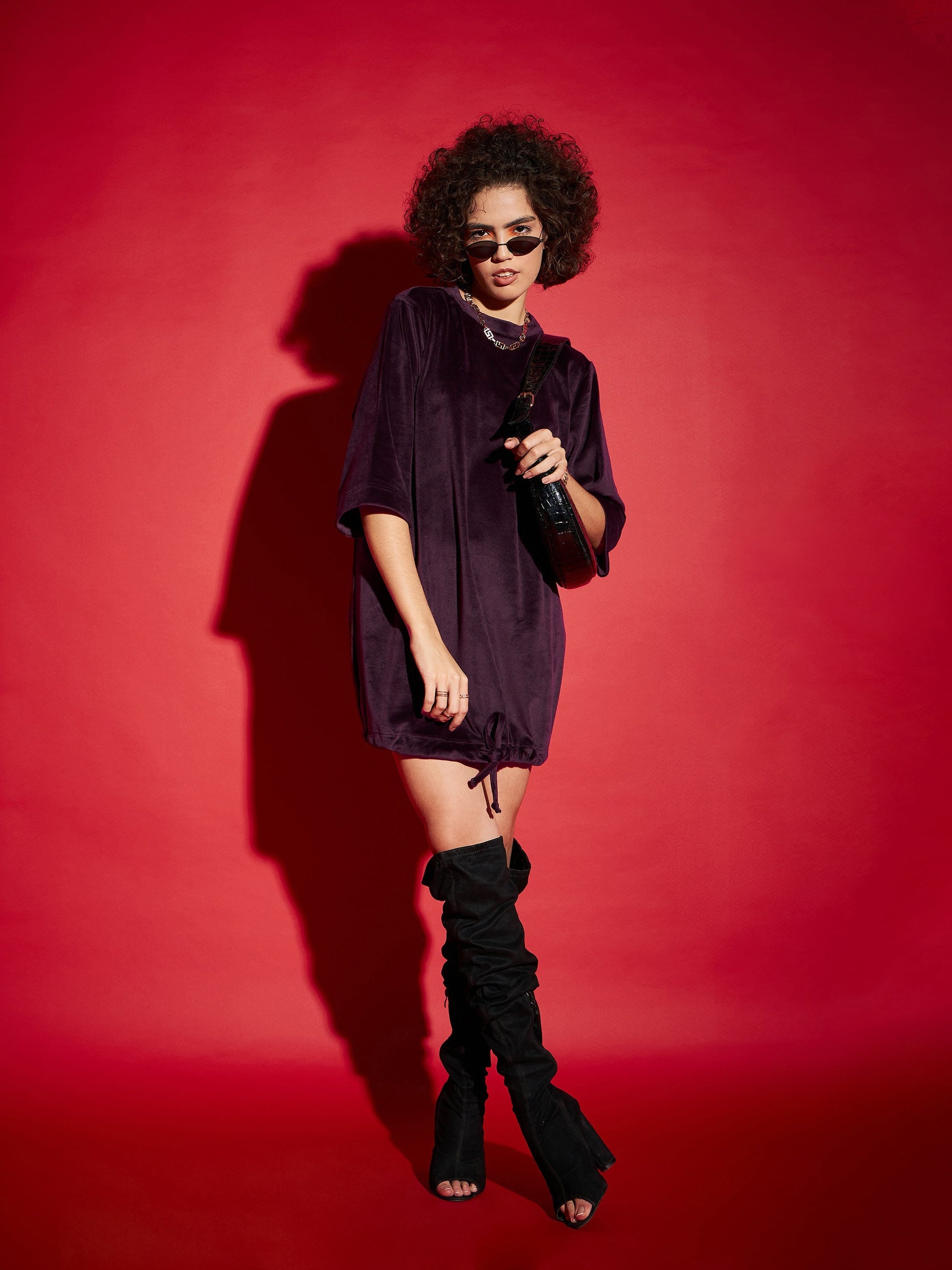Maroon Velour Tie Hem Mini Dress, in Velour fabric, Unlined, Above Knee, Comfort Fit, No Closure, Straight Hemline and features Tie Hem Detail