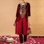 Women Maroon Velvet Embroidered Round Neck Kurta With Pencil Pants