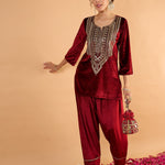 Maroon Velvet Embroidered Short Kurta With Farshi Salwar, in Velvet fabric, Unlined, Above Knee, Comfort Fit/Straight Fit, No Closure, Straight Hemline and features Embroidery Detail At Front Neck