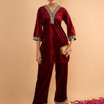 Women Maroon Velvet Embroidered Short Kurta With Straight Pants