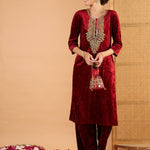 Women Maroon Velvet Embroidered Straight Kurta With Straight Pants