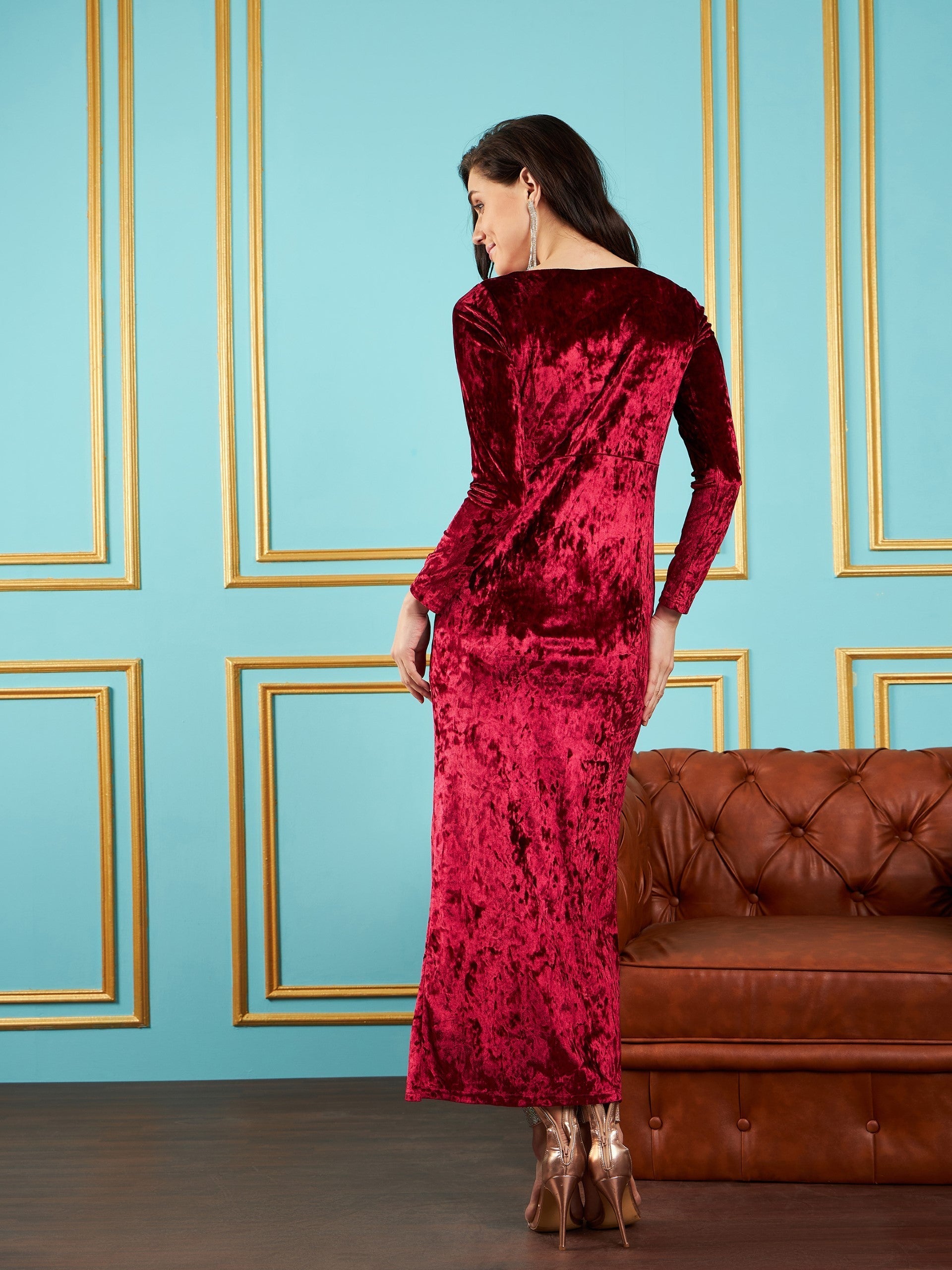 Maroon Velvet Front Slit Maxi Dress, in Velvet fabric, Unlined, Maxi Length, Bodycon, No Closure, Straight Hemline and features Slit At Front