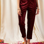Maroon Velvet Pencil Pants, in Velvet fabric, Unlined, Ankle Length, Tapered Fit, Elastic At Back Waist, Straight Hemline and features Plastic Button Detail
