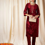 Women Maroon Velvet Pocket Embroidery Straight Kurta