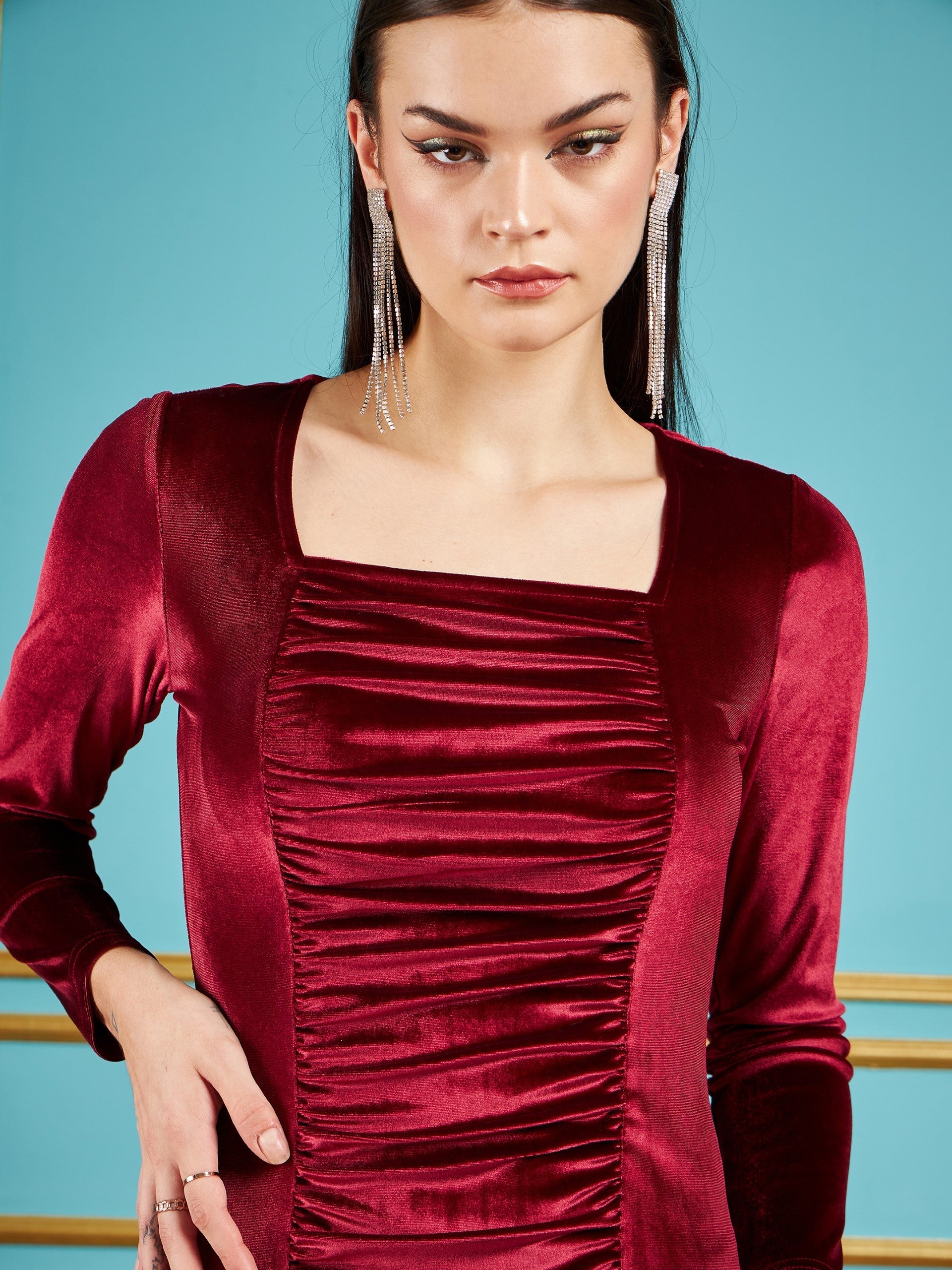 Women Maroon Velvet Ruched Bodycon Dress