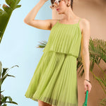 Mint Green Pleated Short Strappy Skater Dress, in Weightless Georgette fabric, Polyester Lining, Knee Length, Fit And Flare, Elasticated Waistline, Flared Hemline and features Pleated Layer On Bodice