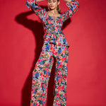 Multi Floral Peplum Top With Straight Pants, in Poly Crepe fabric, NA, Regular Length, Regular Fit / Comfort Fit, No Closure, Flared Hemline and features Back Tie Detail/ Dori At Waist