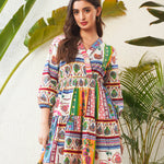 Women Multi Patch Printed Shawl Collar Tiered Dress