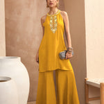 Women Mustard Embroidered Halter Kurta With Palazzos