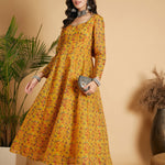 Mustard Floral Anarkali Maxi Dress, in Chanderi Poly Silk fabric, Butter Crepe, Maxi Length, Fit & Flare, Zipper Closure, Flared Hemline and features Doori Detail At Back