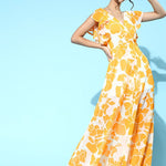 Mustard Floral Frill Sleeve Maxi , in Georgette fabric, Polyester , Full Length, Fit & Flare, Eye- Hook, Flared Hemline and features Frilly Sleeve Detail