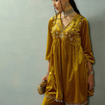 Mustard Velvet Embroidered Peplum Top With Palazzos, in Velvet fabric, Unlined, Regular Length, Comfort Fit, No Closure, Straight Hemline and features Embroidery Detail At Front