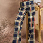 Navy Blue Check High Rise Wide Leg Pants, in Canton fabric, Unlined, Full Length , Comfort Fit, Zipper closure, Straight Hemline and features Pleate Detail At Waist