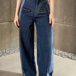 Navy Blue ColorBlock Zipper Detail Wide Leg Jeans, in Denim fabric, Unlined, Full length, Straight Fit, Zipper Closure, Straight Hemline and features Zipper Pocket Detail At Front