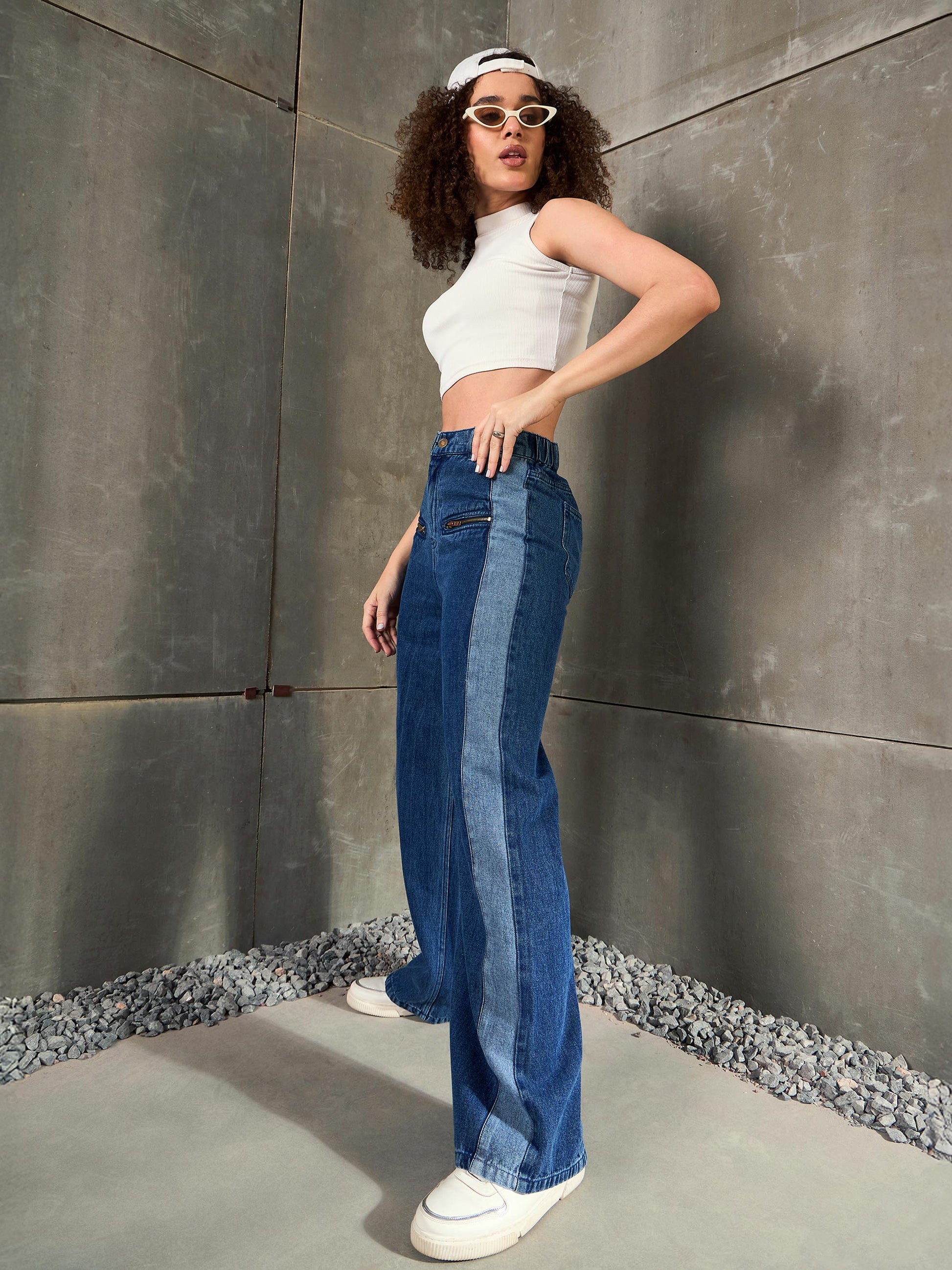 Women Navy Blue Colo Block Zipper Detail Wide Leg Jeans