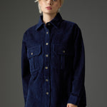 Navy Blue Corduroy Oversized Shirt, in Corduroy fabric, Unlined, Regular Length, Oversize Fit, Button Closure, Curved Hemline and features Flap Pockets At Front