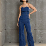 Women Navy Blue Denim Off Shoulder Jumpsuit