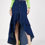 Navy Blue Denim Ruffle High Low Skirt , in Denim fabric, Unlined, Ankle Length , Comfort Fit, Button Closure, Flared Hemline and features Self Ribbed Design