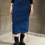 Navy Blue Denim Side Ruching Pencil Skirt, in Denim fabric, Unlined, Below Knee, Straight Fit, Zipper Closure, Straight Hemline and features Slit At Back