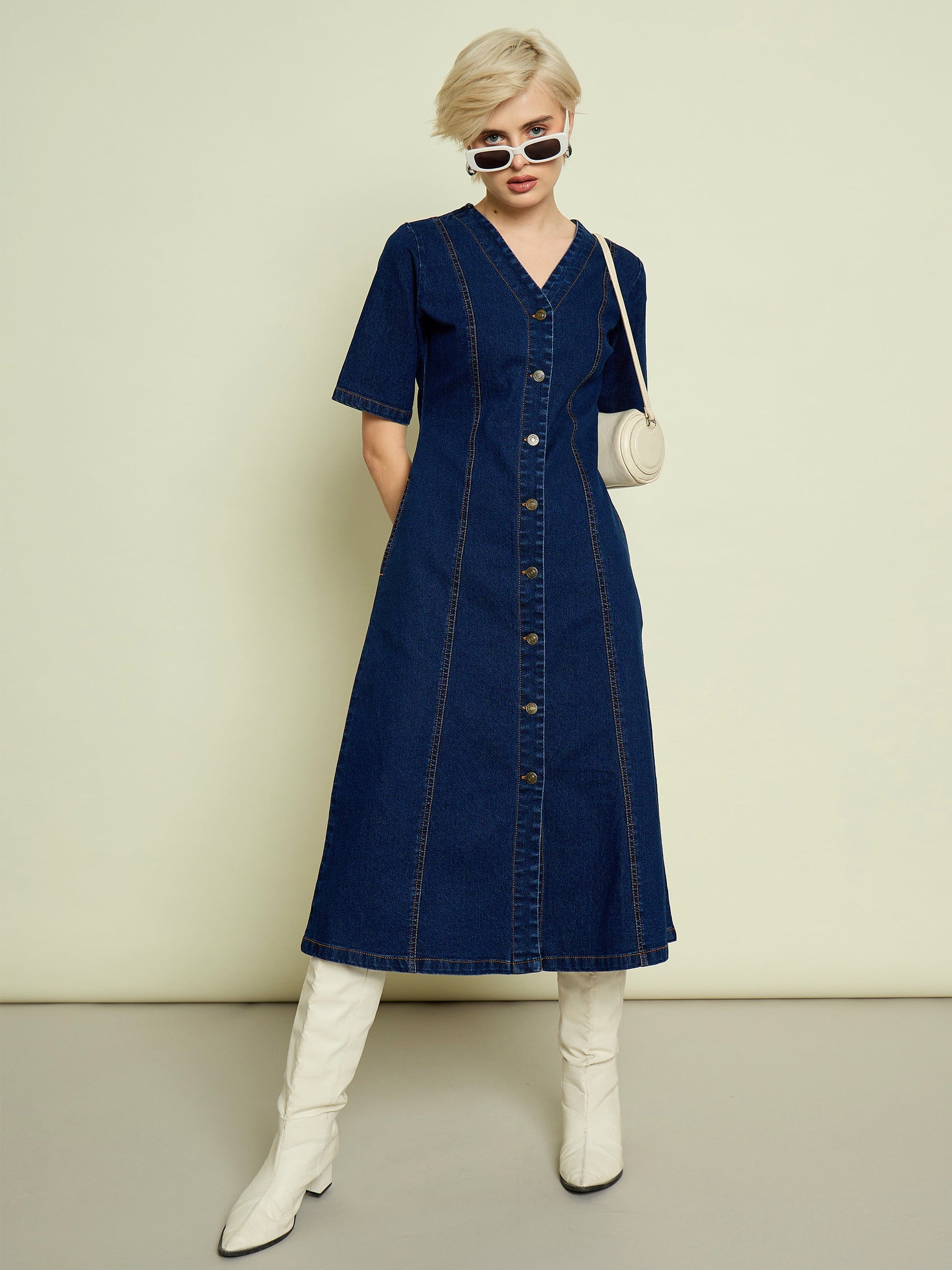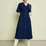 Navy Blue Denim V Neck Midi Dress, in Denim Lycra fabric, Unlined, Midi Length, Fit & Flare , Button Closure, Flared Hemline and features Pockets Detail At Side