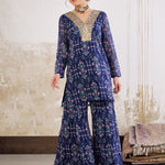 Navy Blue Floral Short Kurta With Palazzo Pants, in Georgette fabric, Butter Crepe Lining, Above Knee, Comfort Fit, No Closure, Straight Hemline and features Lace Detail At Neck