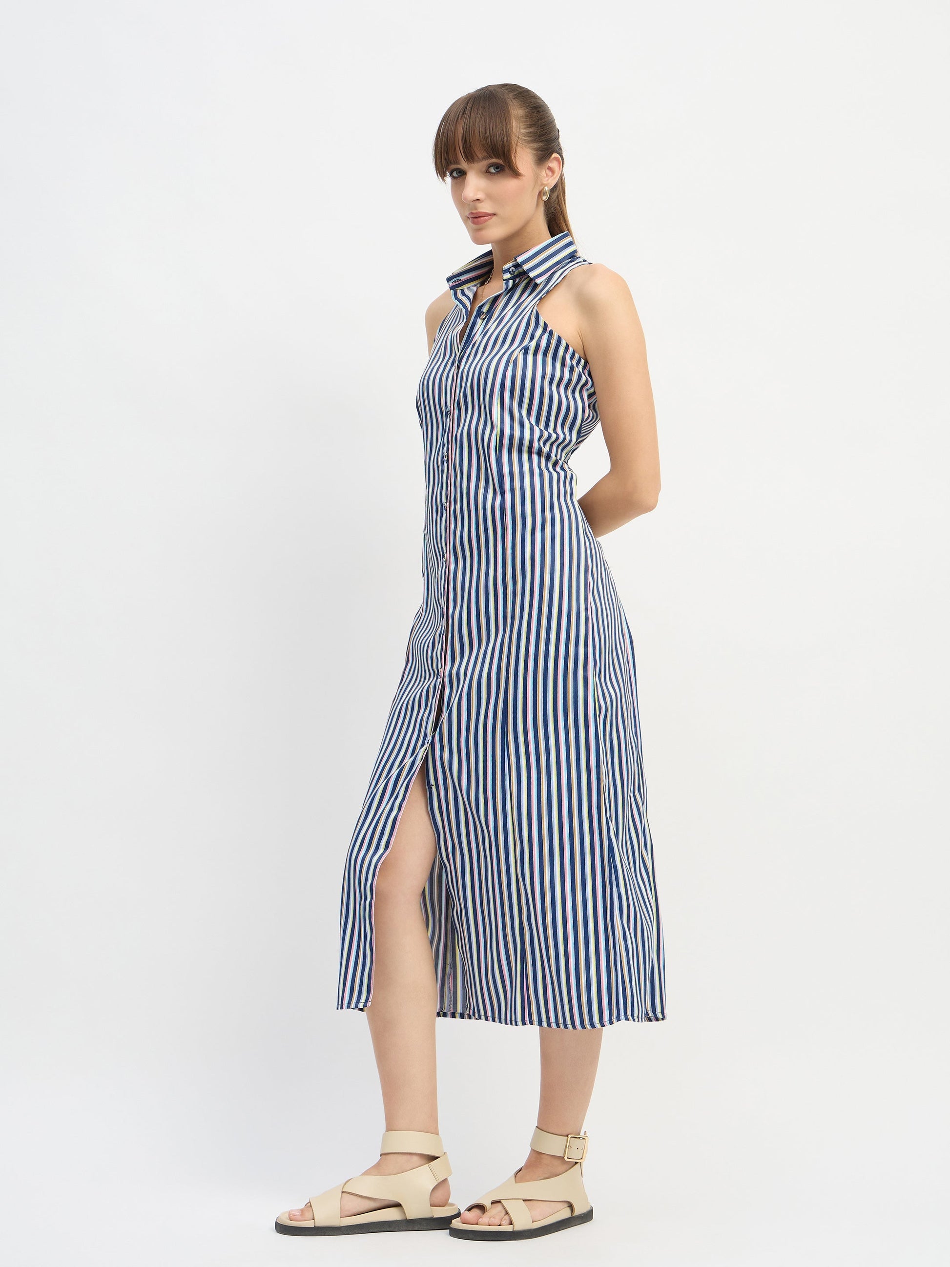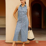 Women Navy Blue Penny Stripes Sleeveless Midi Dress