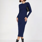 Navy Blue Rib Bodycon Full Sleeves Midi Dress, in Rib fabric, Unlined, Midi Length, Slim Fit, No Closure, Straight Hemline and features Self Ribbed Design