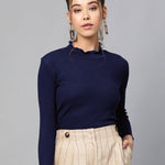 Navy Blue Rib High Neck Full Sleeve Top , in Rib fabric, Unlined, Regular Length, Slim Fit, No Closure, Straight Hemline and features Baby Overlock Detail At Neck