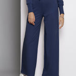 Women Navy Blue Terry Wide Leg Drawstring Pants