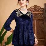 Women Navy Blue Velvet Embroidered Peplum Top