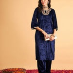Women Navy Velvet Front Zari Embroidered Straight Kurta