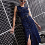 Navy Blue Waist Cut-Out Midi Dress, in Denim fabric, Casual , Below Knee , Button Closure , Unlined , Contrast Stitch Detail Hemline and features 4 Pockets