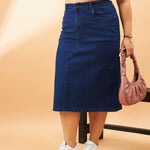 Navy Denim Acid Wash A-Line Skirt, in Denim fabric, Unlined, Knee Length, Comfort Fit, Button Closure, Straight Hemline and features Pocket Detail