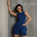 Navy Denim Front Open Sleeveless Top With Shorts, in Denim fabric, Unlined, Regular Length, Comfort Fit, Button Closure, Straight Hemline and features Slit At Back