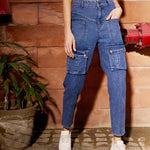 Navy Denim Front Patch Pocket Jeans, in Denim fabric, Unlined, Ankle Length, Comfort Fit, Button Closure, Straight Hemline and features Patch Pocket Detail