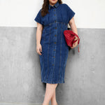 Navy Denim Kimono Sleeves Midi Dress, in Denim Lycra fabric, Unlined, Midi Length, Comfort Fit, Button Closure, Straight Hemline and features Kimono Sleeves Dress