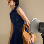 Women Navy Denim Round Neck Short Dress