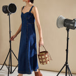 Navy Denim Strappy A-Line Midi Dress, in Denim fabric, Unlined, Midi Length, A-Line, Zipper Closure, Straight Hemline and features Pocket At Front