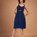Navy Denim Wash Strappy Dress, in Denim fabric, Unlined, Knee Length, Slim Fit, Button Closure, Straight Hemline and features Cut Out Detail At Front