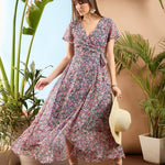 Women Navy Ditsy Floral Ruffle Detail Wrap Midi Dress