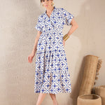 Women Navy Ethnic Print Collar Tiered Midi Dress