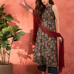 Women Navy Floral Sleeveless Kurta With Pencil Pants & Dupatta