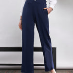 Navy Front Darted Knitted Straight Pants, in Canton Knit fabric, Unlined, Full Length , Straight Fit, Button Closure, Straight Hemline and features Front Dart Detail