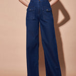 Women Navy High Waist Flap Pocket Straight Jeans