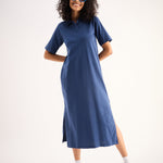 Navy Oversized Collar T-Shirt Dress, in Cotton Jersey fabric, Unlined , Midi Length, Oversized Fit, Button Closure, Straight Hemline and features Polo collar Detail
