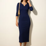 Women Navy Rib Deep V-Neck Ankle Midi Dress