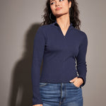 Navy Rib High Neck Front Zipper Top, in Rib fabric, Unlined, Regular Length, Slim Fit, Zipper Closure, Straight Hemline and features Concealed Zip Detail At Neck
